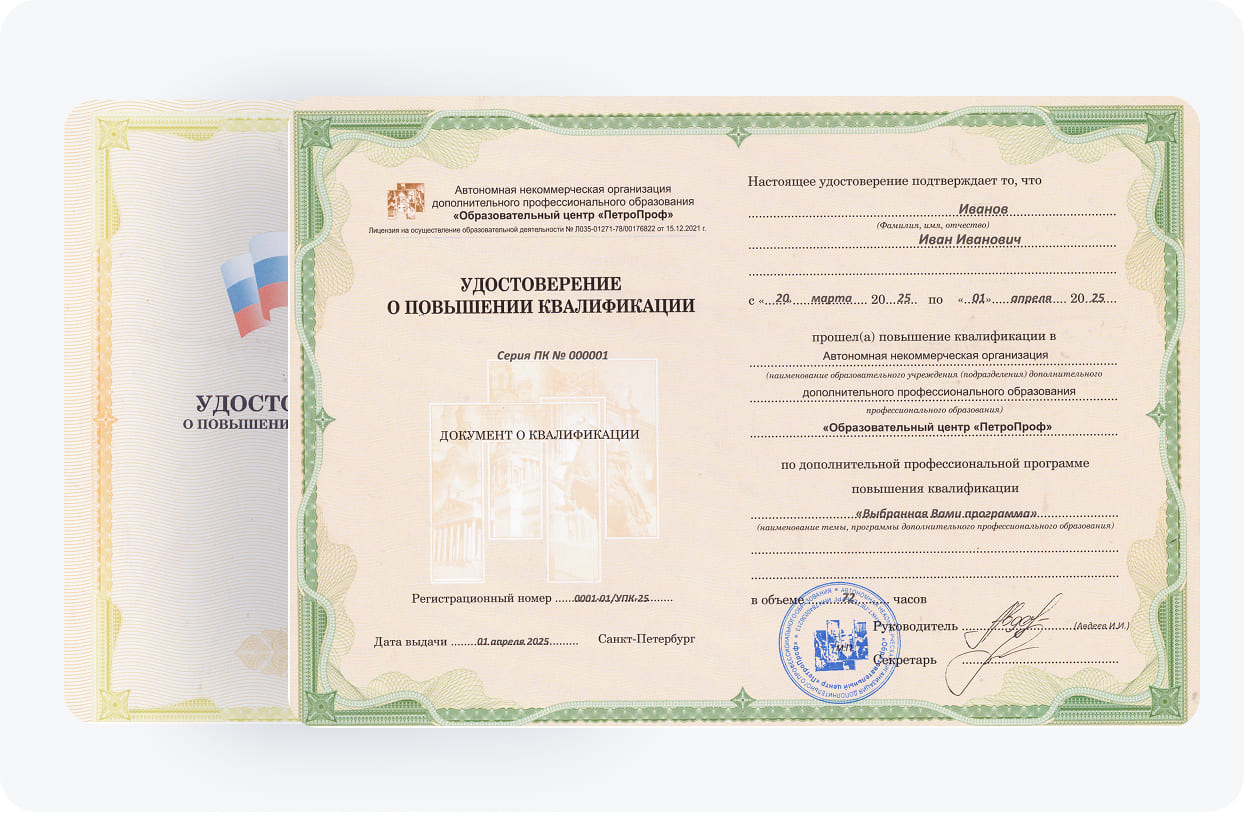 Наши программы ПК разработаны специально для тех, кто хочет повысить свою квалификацию и оставаться востребованным специалистом на рынке труда. После успешного завершения курса каждый участник получит удостоверение о повышении квалификации (УПК), которое подтверждает уровень проф.подготовки и позволяет подтвердить компетенции перед работодателями.